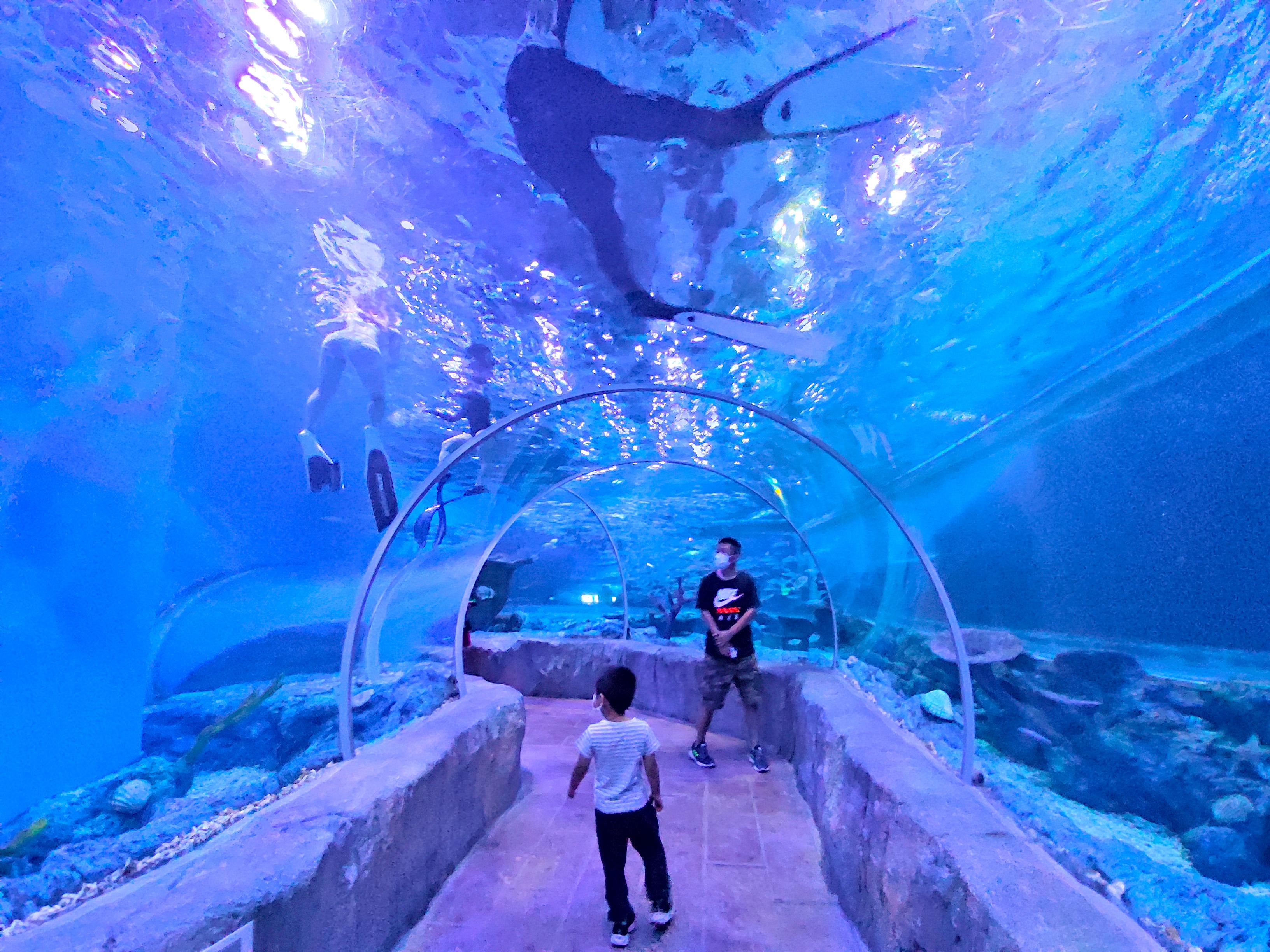 海洋馆包含各种观赏鱼、海洋隧道、美人鱼表演、海狮表演,鱼的品种丰富多样,还可以体验潜水。漫步在波光粼粼的隧道里,被包围在静谧的蓝色之中。五颜六色、各式鱼群成群结队,仿佛伸手就能触摸。这样一个有着神秘元素和古老意境的海洋馆,是不是让你也想要去一探究竟呢?