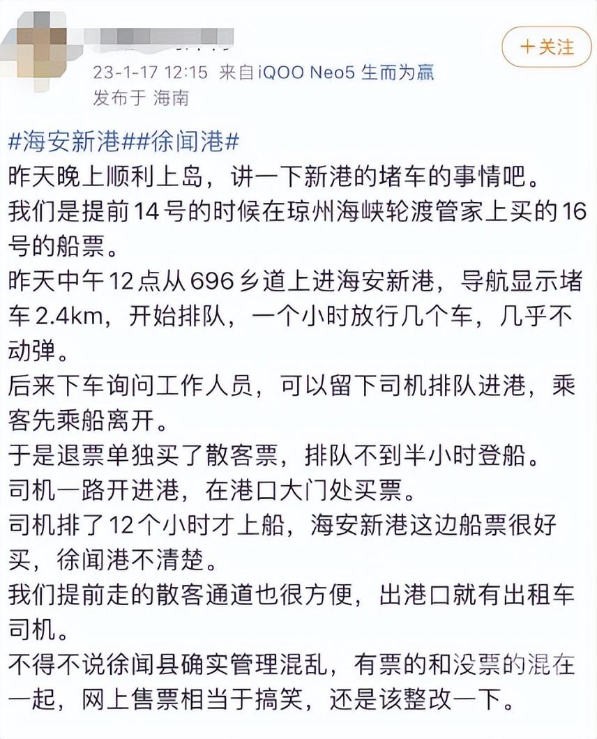 昨天,橙柿互动记者在网上看到,多位网友发帖表示,堵在徐闻港十几个小时,才登上船。